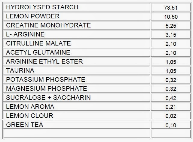Almidón hidrolizado (amilopectina 99%), limón en polvo (Citrus limonum), creatina ethyl ester, arginina alfa keto glutarato, citrulina malato, N-acetil glutamina, arginina etil ester, taurina, fosfato potásico, fosfato de magnesio, té verde (Camellia sinensis), nuez de cola , aroma (aroma de limón) edulcorante (sucralosa y sacarina) y colorante (E-102).