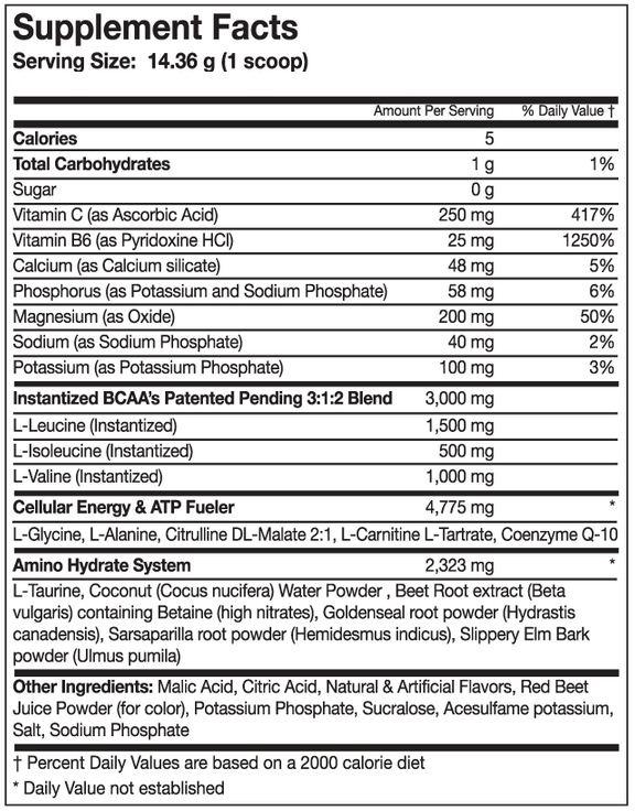 Su fórmula exclusiva contiene una mezcla instantanizada de BCAAs cn una relación de 3:1:2 entre L-Leucina instantanizada, L-isoleucina instantanizada y L-Valina instantanizada; una mezcla para la energía celular y el ATP muscular que contiene L-glicina, L-alanina, citrulina DL-malato 2:1, L-Carnitina L-Tartrato y coenzima Q-10; y el nuevo sistema de hidratación y electrolitos que contiene L-Taurina, agua de coco en polvo (Cocus nucifera), extracto de raíz de remolacha (Beta vulgaris), contiene betaína (nitratos altos), raíz de Goldenseal en polvo (Hydrastis canadensis), raíz de zarzaparrilla en polvo (Hemidesmus Indicus), corteza de olmo en polvo (Ulus Pumila), y los electrolitos y vitaminas Vitamina C (como ácido ascórbico), Vitamina B6 (Piridoxina HCL Como), Calcio (como silicato de calcio), Fósforo (como potasio y fosfato de sodio), Magnesio (como óxido de magnesio), Sodio (como fosfato sódico) y Potasio (como fosfato de potasio)