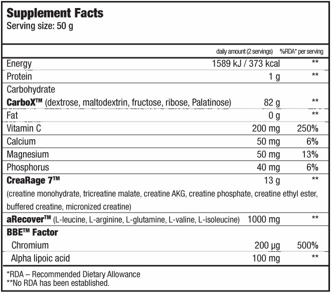 CarboX™ (dextrosa, maltodextrina, fructosa, ribosa, palatinosa), CreaRage 7™ (monohidrato de creatina, malato tricreatina, creatina AKG, fosfato de creatina, éster etílico de creatina, creatina tamponada, la creatina micronizada), aRecover™ (L-leucina, L-arginina, L -glutamina, L-valina, L-isoleucina), ácido ascórbico, fosfato tricálcico, fosfato dimagnésico, BBE™ Factor (picolinato de cromo, ácido alfa lipoico), edulcorantes (sucralosa, acesulfamo-K), aroma.