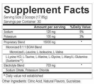 Mezcla de BCAAs 8:1:1 micronizados ((L-Leucina Micronizada, L-Isoleucina, L-Valina), L-Alanina, L-Taurina, L-Lisina HCI, L-Glicina, L-Alanil-L-glutamina (Sustamine™)), mezcla de electrolitos (Citrato Sódico, Cloruro de Potasio), Ácido Cítrico, Sabores Naturales, Sucralosa, Dióxido de Silicio.