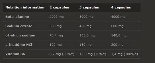 56,2% beta-alanina, agente espesante – celulosa microcristalina; 8,4% citrato sódico, espesantes – hidroxipropil metil celulosa, celulosa sódica carboximetil de unión cruzada; 2,8% L-histidina hidroclorhidrato, agentes anti-apelmazantes – dióxido de silicio, estearato de magnesio; hidrocloruro de piridoxina – vitamina B6.