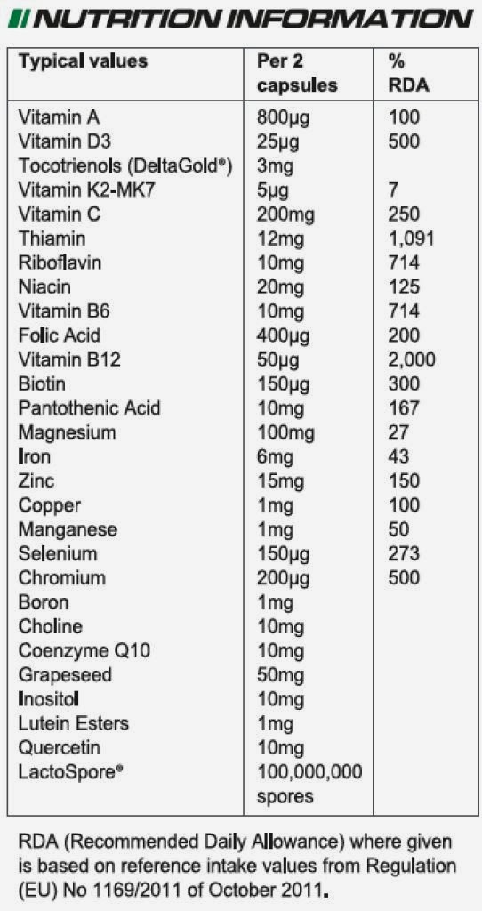 Cápsula de gelatina (gelatina bovina, óxido de hierro): USP Citrato de magnesio, ácido ascórbico, extracto de té verde (95% polifenoles, extracto de semilla de uva (95% proantocianidinas), Zinc, L-monometionina, celulosa microcristalina, estearato de magnesio, L-selenometionina (selenio SELECT®), licopeno (Lyc-O-Mato®), menaquinona-7 (MenaquineGold™) derivado de extracto de harina de soja desgrasada fermentada, tocotrienoles como DeltaGold® (35% tocotrienoles totales de las cuales 84-92 % delta tocotrienol, 8-16% de gamma tocotrienol) obtenido a partir de achiote, maltodextrina, quercetina, nicotinamida, hidrocloruro de piridoxina, riboflavina, colecalciferol, pantotenato de calcio, bitartrato de colina, inositol, hidrocloruro de tiamina, borato de sodio, luteína como BioLUT™ (Tagetes Erecta, Flor (90% de ésteres de luteína de los cuales 45% Trans luteína)), aspartato de cobre, coenzima Q10, Lactospore® Bacillus coagulans, retinil Acitate, aspartato de manganeso, piperina (Bioperine®), dióxido de silicio, picolinato de cromo, ácido pteroilmonoglutámico, D-biotina, metilcobalamina.