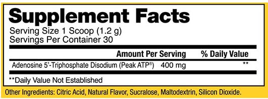 Los músculos necesitan energía para generar fuerza y potencia. La energía se crea a partir de la forma química conocida como trifosfato de adenosina (ATP). Peak 400™ ATP está diseñado para maximizar este proceso. La fórmula de Peak 400™ ATP estimula directamente el sistema muscular, no como la mayoría de los suplementos de pre-entrenamiento que solamente proporcionan una simple estimulación del sistema nervioso central por medio de la utilización de estimulantes como la cafeína o el aceite de geranio.