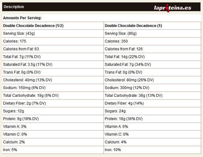 Azúcar, mezcla de proteínas (proteína de soja, proteína de suero), huevos, mantequilla sin sal, polvo de cacao (cacao procesado con álcali), las virutas de chocolate (azúcar, chocolate sin azúcar, manteca de cacao, lecitina de soja, vainilla), chocolate con leche de revestimiento compuesto (el azúcar, almendra de palma parcialmente hidrogenado y aceite de palma, cacao en polvo (procesado con álcali), leche descremada en polvo, suero en polvo, lecitina de soja añadidos como emulsionante, sal y saborizantes artificiales), glicerina, Contiene 2% o menos de lo siguiente: harina blanca de trigo, sabores naturales y artificiales, polvo de hornear, la sal y el sorbato de potasio