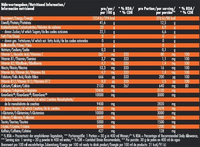 AMINOMIN Complex (aislado de proteína de suero, L-arginina, Krea-Genic® (94% monohidrato de creatina, reguladores de acidez: 6% carbonato sódico), beta-alanina, L-citrulina malato, clorhidrato de L-ornitina, carbonato de calcio, carbonato de magnesio, citrato trisódico, L-valina, café ((coffea arabica L.) cafeína), ácido ascórbico (vitamina C), ácido algínico, nicotinamida (niacina), DL-alfa-tocoferol (vitamina E), D-pantotenato cálcico (ácido pantoténico), piridoxina clorhidrato (vitamina B6), tiamina clorhidrato (vitamina B1), riboflavina (vitamina B2), ácido pteroilmonoglutámico (ácido fólico), D-biotina (biotina), cianocobalamina (vitamina B12)), sacarosa, almidón, acidulantes: ácido cítrico y ácido tartárico; aroma (naranja), antiaglomerante: óxido de silício; edulcorantes: acesulfamo K, ciclamato sódico y sacarina sódica; colorante: E110. E110: Puede tener efectos negativos sobre la actividad y la atención de los niños.