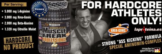 Muscle Freak Professional de Weider dentro de la línea dirigida a culturistas y atletas profesionales Global Weider contiene una mezcla de proteína de aislado de suero, glutamina, arginina y otros aminoácidos libres, vitaminas, minerales, cafeína y la creatina de última generación Krea-Genic® junto con beta alanina para lograr la fórmula de pre-entrenamiento definitiva diseñada exclusivamente para atletas profesionales.