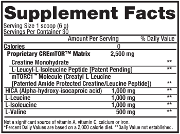 Esta poderoso suplemento para el aumento de la masa muscular y la fuerza combina el monohidrato de creatina, con el nuevo péptido pendiente de patente L-Leucina-L-Isoleucina y la nueva molécula mTORC1™ (un peptido de creatina/leucina unido covalentemente); además de HICA (Acido Alfa-Hidroxi-Isocaprioco) y BCAAs.