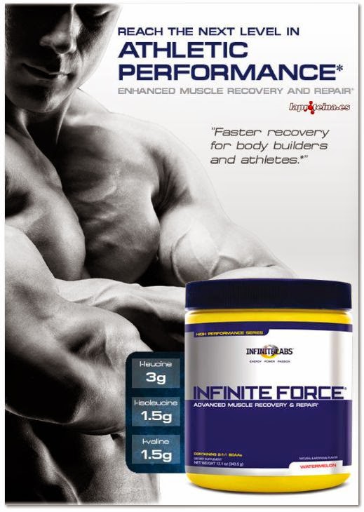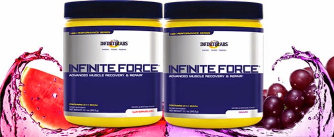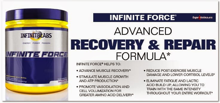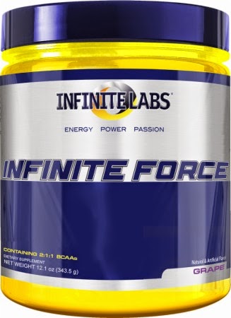 Infinite Force® de Infinite Labs es una fórmula de alto rendimiento para la recuperación muscular que contiene una mezcla precisa de aminoácidos entre los que se incluyen los aminoácidos de cadena ramificada en una proporción de 2:1:1 (L-leucina, L-isoleucina y L-valina), la L-glutamina, CarnoSyn®, una versión patentada de Beta alanina, la N-acetil L-tirosina y la L-fenilalanina, además de vitaminas para mejorar la tasa de recuperación muscular y ayudar en la reposición de glucógeno muscular para potenciar el rendimiento deportivo en general.