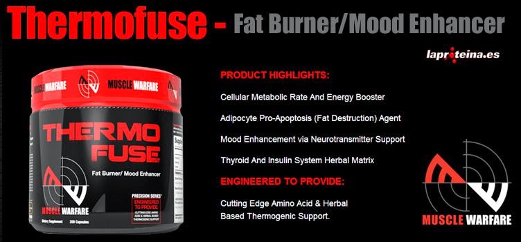 ThermoFuse™ de Muscle Warfare es un potente quemador de grasas que mejora el estado de ánimo y que ha sido específicamente diseñado para aumentar la tasa metabólica y producir una intensa energía, favorecer la apoptosis de adipocitos, y ayudar a la optimización del tiroides y de la insulina.