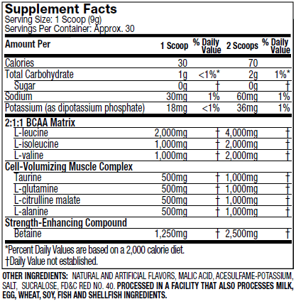 Contiene una extraordinaria fórmula que combina los importantísimos aminoácidos de cadena ramificada L-Leucina, L-isoleucina, L-valina en una proporción 2:1:1, con una mezcla especial de otros aminoácidos para aumentar el volumen celular compuesta por Taurina, L-glutamina, L-citrulina malato y L-alanina, además de Betaína para aumentar la fuerza muscular.