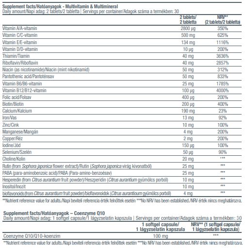Comprimido de Multivitamin & Multimineral: agentes de carga (gel de celulosa, hidroxipropilmetilcelulosa, fosfatos de calcio), ácido L-ascórbico, carbonato de calcio, acetato de DL-alfa-tocoferilo, recubrimiento [agente de carga (hidroxipropilmetilcelulosa), colorantes (dióxido de titanio, óxidos e hidróxidos de hierro), gluconato de zinc, antiaglomerantes (dióxido de silicio, sales magnésicas de ácidos grasos), D-pantotenato cálcico, nicotinamida, clorhidrato de tiamina, bitartarato de colina, riboflavinea, fumarato ferroso II, palmitato de retinilo, gluconato de manganeso, clorhidrato de piridoxina, extracto de flor de acacia del Japón (Sophora japonica), ácido paraaminobenzoico, fruta de naranjo amargo en polvo (Citrus aurantium), gluconato cúprico, inositol, L-seleniometionina, colecalciferol, ácido pteroilmonoglutámico, D-biotina, yoduro de sodio, cianocobalamina.