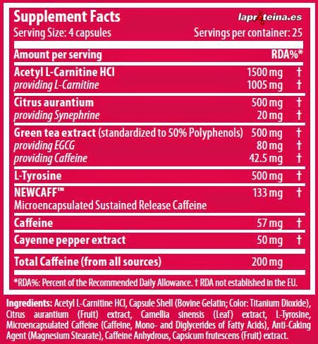 Acetil-L-carnitina HCl, agente de recubrimiento (gelatina bovina; colorante: dióxido de titanio), extracto de fruta de Citrus aurantium, extracto de hoja de Camelia sinensis, L-tirosina, cafeína microencapsulada (cafeína, mono-y diglicéridos de ácidos grasos), antiaglomerante (estearato de magnesio), cafeína anhidra, extracto de fruta de Capsicum frutescens.