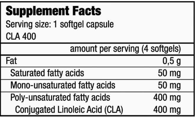 Cápsula blanda de CLA 400 (Grasa, Ácidos grasos saturados, Ácidos grasos monoinsaturados, Ácidos grasos poliinsaturados, Ácidos linoleicos conjugados).