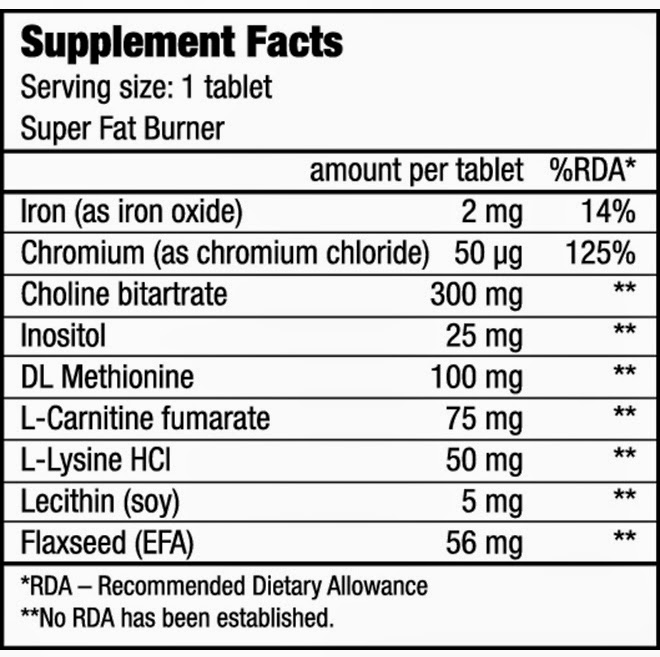 Comprimido de Super Fat Burner (Hierro (en óxido de hierro), Cromo (como cloruro de cromo), Bitartrato de colina, Inositol, DL-metionina, L-carnitina fumarato, L-lisina (como L-lisina HCl), Lecitina de soja, Semillas de lino (ácidos grasos esenciales)).