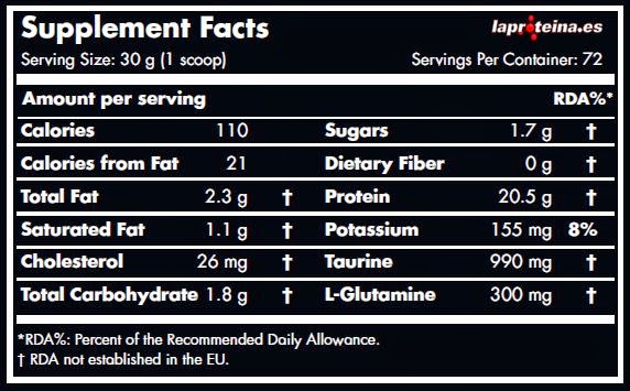 - Contiene el 100% de concentrado de proteína de suero de leche ultrafiltrado a baja presión y temperatura (instantanizado).