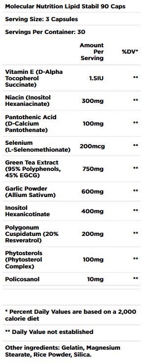 Vitamina E (Succinato de tocoferol D-alfa), Niacina (Hexaniacinato de Inositol), Ácido Pantoténico (Pantotenato de D-Calcio), Selenio (L-Selenometionato), Extracto de té verde (95% de polifenoles, 45% de EGCG), Polvo de Ajo (Allium Sativum), Inositol Hexanicotinato, Polygonum Cuspidatum (20% Resveratrol), Fitosteroles (complejo de fitosterol), Policosanol.