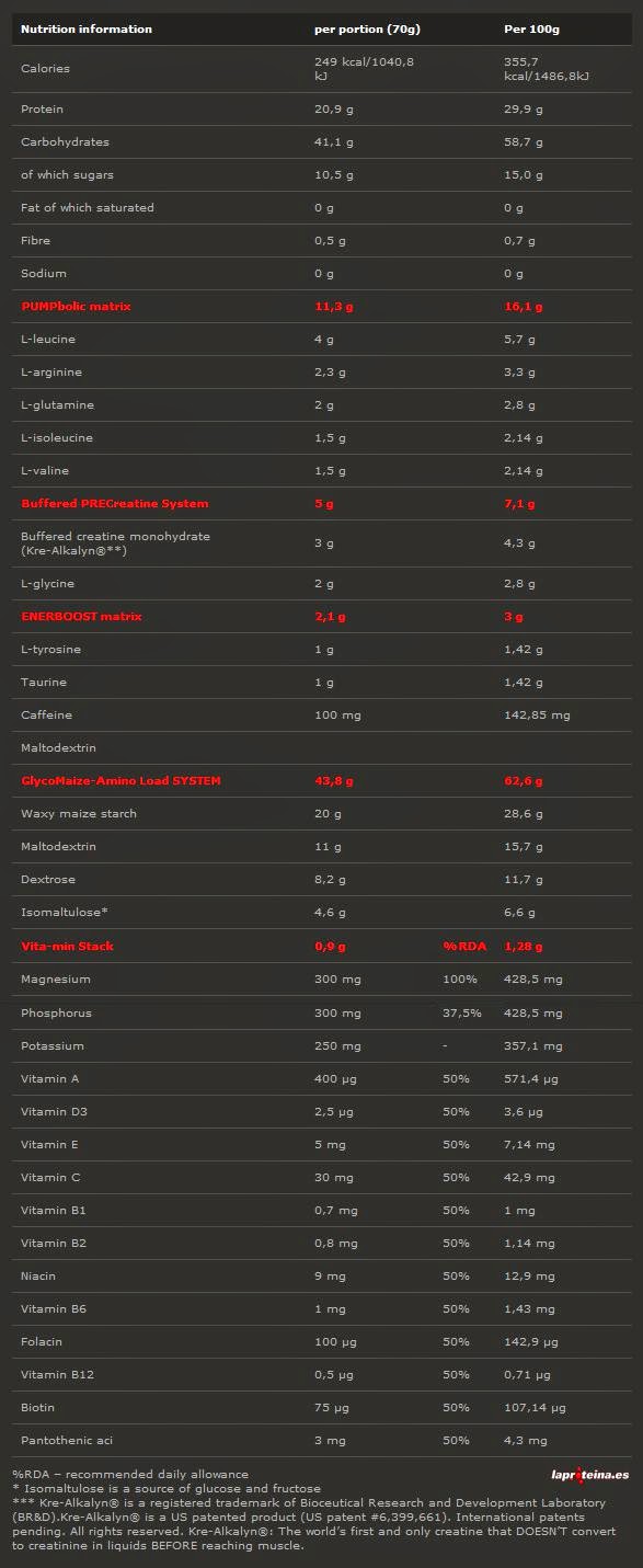 L-Arginina , L-Leucina, L-Isoleucina, L-Valina, L-Glutamina, Kre-Alkalyn, L-Glicina, L-Tirosina, Taurina, Cafeína, almidón de maíz ceroso (Waxy Maize), Maltodextrina, Dextrosa, Isomaltulosa, tri-calcio fosfato, óxido de magnesio, fosfato de hidrógeno-di potasio, cloruro de potasio, ácido L-ascórbico - Vitamina C, acetato de dl-alfa-tocoferol - vitamina E, nicotinamida - niacina, D-biotina, acetato de retinilo - Vitamina A, D-pantotenato cálcico - ácido pantoténico, hidrocloruro de piridoxina - Vitamina B6, colecalciferol - Vitamina D, ácido pteroilmonoglutámico - ácido fólico, mononitrato de tiamina - Vitamina B1, riboflavina - Vitamina B2, cianocobalamina - Vitamina B12, reguladores de la acidez - ácido málico, ácido cítrico; aromas, espesantes - goma de acacia, goma de celulosa; agentes antiapelmazantes - fosfato de hidrógeno de calcio, dióxido de silicio, edulcorantes - ciclamato de sodio, aspartamo, el sacarinato de sodio, acesulfamo K; color: E110 (sabor naranja), E104 (sabor limón).