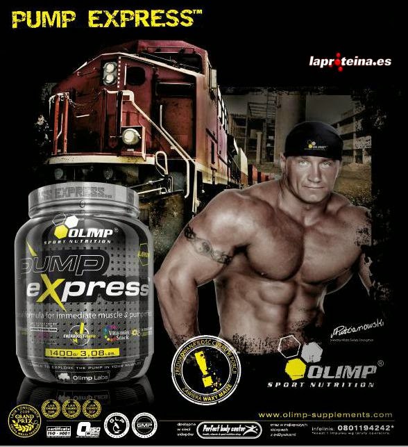 Pump Express™ te proporciona el máximo "bombeo muscular" gracias a un incremento del suministro de sangre a los músculos durante el entrenamiento. Este efecto aumenta la absorción de sustancias anabolizantes y de los nutrientes contenidos en esta fórmula, que a su vez mejora la función muscular y la resistencia, y conduce a un aumento significativo de la masa muscular.