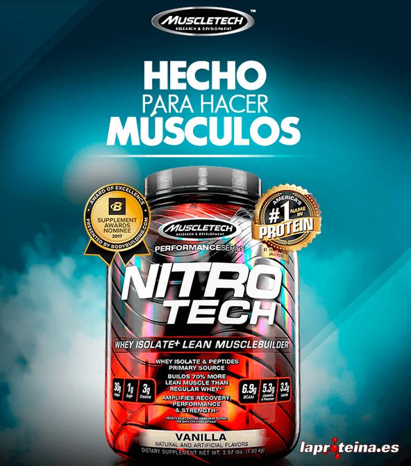 Nitro Tech™ Performance Series de MuscleTech es una proteína que contiene como fuente proteica principal el aislado de proteína de suero de leche de la mayor calidad posible (aislado e hidrolizado de suero) que se complementa con un extra de proteína de concentrado de suero ultrafiltrado y una matriz anabólica de aminoácidos (aminoácidos de cadena ramificada y glutamina), y que ha sido diseñada para proporcionarte el máximo crecimiento muscular.
