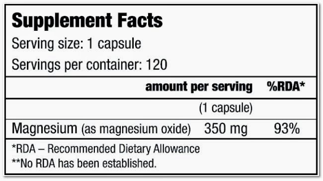 - Aporta 350 mg de magnesio por cápsula (93% RDA).