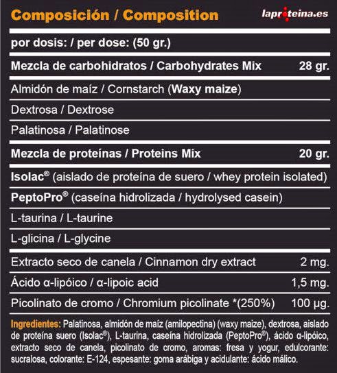 Mezcla de carbohidratos (almidón de maíz , dextrosa y palatinosa), mezcla de proteínas (aislado de suero Isolac, PeptoPro, L-Taurina y L-Glicina), extracto seco de canela, ácido alfa lipóico y picolinato de cromo.