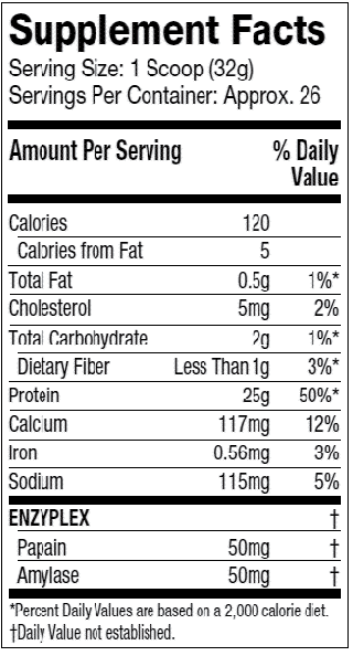 - 25 gramos de proteína, 5,6 gramos de BCAAs y 4,4 gramos de glutamina y otros precursores por servicio.