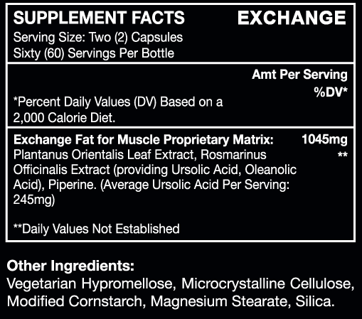 Mezcla patentada Exchange Fat for Muscle: (extracto de hoja de plantanus orientalis, extracto de Rosmarinus officinalis [proporciona ácido ursólico, ácido oleanólico], piperina).