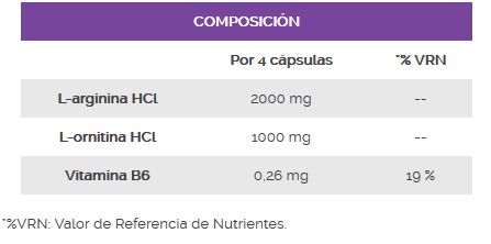 L-arginina HCl, L-ornitina HCl, antiaglomerante (estearato de magnesio vegetal) y vitamina B6 (clorhidrato de piridoxina).