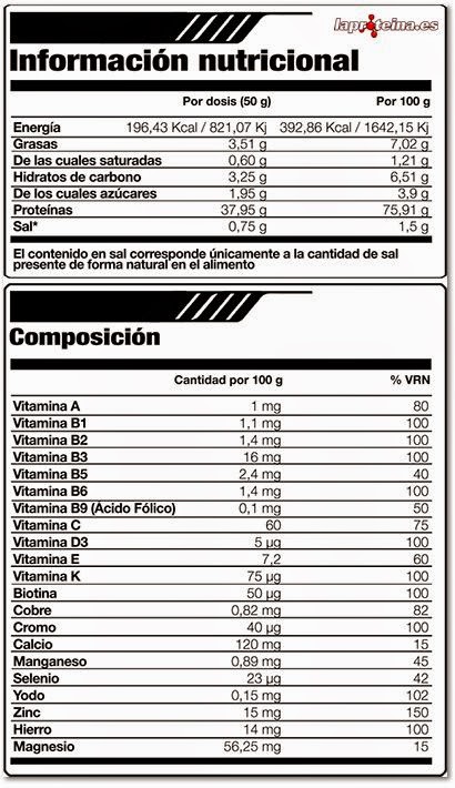 Sabor Vainilla con Avellanas: concentrado de proteína de leche, aislado de proteína de soja, aislado de proteína de leche, colágeno hidrolizado, ovoalbúmina, lecitina de soja, aromas, calcio natural de leche, carbonato de magnesio, L-carnitina tartrato, isoflavonas de soja, edulcorante E-955, extracto seco de piña (Ananas comosus), edulcorane E-954, extracto seco de café verde (coffea arábica), extracto seco de alcachofa (Cynara scolymus), extracto seco de cola de caballo (Equisetum arvense), extracto seco de mango africano (Irvingia gabonensis), carbonato de calcio, sulfato de magnesio, ácido L-ascórbico, fumarato ferroso, óxido de zinc, cloruro de potasio, niacinamida, acetato de D, L-alfatocoferol, gluconato de manganeso, pantotenato de calcio, gluconato de cobre, acetato de retinol, beta caroteno, vitamina B1 HCl (clorhidrato de tiamina), vitamina B2 (riboflavina), vitamina B6 HCl (clorhidrato de piridoxina), vitamina K, ácido fólico, yoduro de potasio, picolinato de cromo, biotina, selenito de sodio y vitamina D3 (colecalciferol).