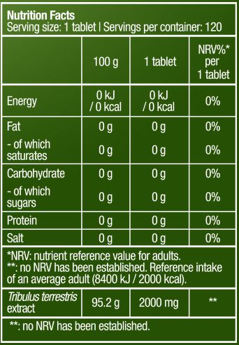 - Proporciona 2.000 mg de extracto de tribulus terrestris por tableta.