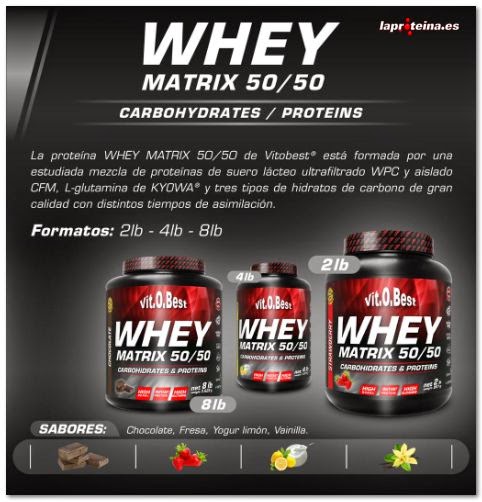 Whey Matrix 50/50 de Vit.O.Best es un suplemento nutricional compuesto por una mezcla al 50% entre carbohidratos y proteínas de gran calidad que ha sido reforzado con creatina, glutamina Kyowa™ y taurina para un mayor efecto anabólico.