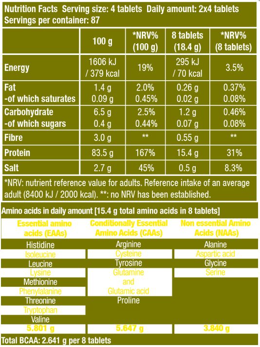 Cada tableta aporta 1925 mg de aminoácidos que se absorben instantáneamente en el torrente sanguíneo para mantener unos niveles positivos de nitrógeno, un mayor nivel de crecimiento muscular, y reducir la grasa corporal.