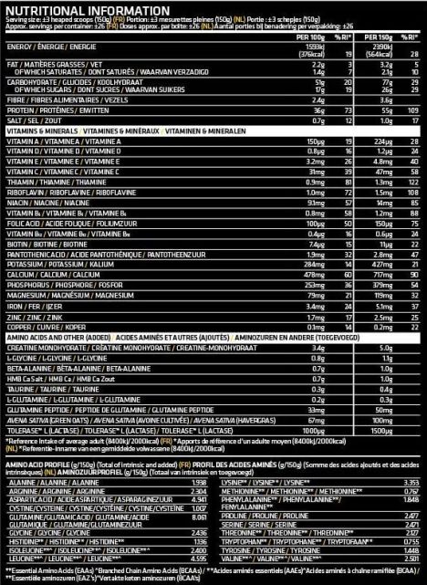 matriz de carbohidratos (maltodextrina, dextrosa monohidratada, fructosa), matriz de proteínas (concentrado de proteína de suero (LECHE), aislado de proteína de SOJA, aislado de proteína de LECHE, albúmina de HUEVO, caseinato de calcio), cacao en polvo, creatina monohidratada, aromas, espesantes (goma guar, goma xantana), almidón, L-glicina, grasa alimentaria en polvo (aceite de palma, suero en polvo (LECHE), proteína de LECHE, estabilizante (tripolifosfato de sodio), antiaglomerante (dióxido de silicio), antioxidante (tocoferoles)), β-hidroxi-β-metilbutirato de calcio, β-alanina, aminoácidos de cadena ramificada, fosfato de tricalcio, lactato de magnesio, citrato de tripotasio, estabilizante (goma de celulosa), cloruro de sodio, taurina, edulcorantes (sucralosa, acesulfamo K), L-glutamina, AVENA sativa (AVENA), mezcla de vitaminas (ácido ascórbico, pteroil-L-glutamato, D-α-tocoferol, Nicotinamida, D-pantotenato de calcio, Riboflavina, Clorhidrato de piridoxina, clorhidrato de tiamina, palmitato de retinilo, metilcobalamina, biotina, colecalciferol), péptidos de glutamina (trigo), antiaglomerante (dióxido de silicio), bisglicinato de zinc, Tolerase™ L (lactasa estable al pH)