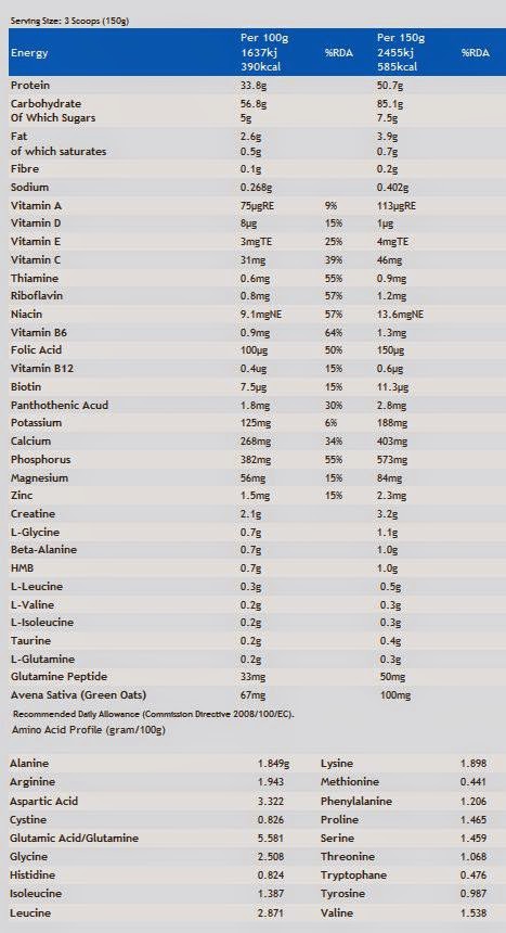 Carb Matrix (Maltodextrina, Dextrosa Monohidrato, Fructosa), Protein Matrix (Concentrado de Proteína de Suero, Aislado de Proteína de Soja, Albúmina de Huevo, Caseinato de Calcio, Concentrado de Proteína de Leche), Creatina Monohidrato, L-Glicina, Trigliceridos de Cadena Media, Aceite de Coco, Beta Alanina, HMB, Fosfato Tricálcico, L-Leucina, Almidón de Arroz, Lactato de Magnesio, Aromas, Citrato de Potasio, L-Taurina, L-Glutamina, L-Valina, L-Isoleucina, Creatina HCL, Cacao (En Polvo), Estabilizante (Goma de Celulosa), Avena Sativa, Péptidos de Glutamina, Ácido L-Ascórbico, Edulcorante no nutritivo (Sucralosa), Aceite de Girasol, Nicotinamida, Acetato D-Alfa Tocoferol, Agente Antiaglomerante (Dióxido de Silicio), Glicinato de Zinc, D-Pantotenato Cálcico, Piridoxina-5-Fosfato, Riboflavina, Tolerase™ (pH-stable Lactase), Clorhidrato de Tiamina, Vitamina A, Ácido Fólico, Biotina, Colecalciferol, Cianocobalamina.