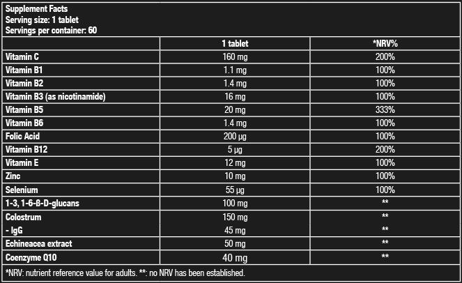 Agentes de carga (sorbitol, fosfato dicálcico), vitamina C (ácido L-ascórbico), antiaglomerantes (celulosa microcristalina, dióxido de silicio), colostro, beta-glucanos de levadura (Saccharomyces cerevisiae), gluconato de zinc, extracto de planta entera de Echinacea purpurea, recubrimiento [estabilizantes (hidroxipropilmetilcelulosa, carboximetilcelulosa), antiaglomerante (talco), aceite de MCT, colorante (dióxido de titanio)], estabilizantes (estearato de magnesio, carboximetilcelulosa sódica), coenzima Q10, vitamina E (acetato de DL-alfa-tocoferilo), vitamina B5 (D-pantotenato cálcico), vitamina B3 (nicotinamida), vitamina B12 (cianocobalamina), vitamina B6 (clorhidrato de piridoxina), vitamina B2 (riboflavina), vitamina B1 (clorhidrato de tiamina), ácido fólico (ácido pteroilmonoglutámico), selenito de sodio.