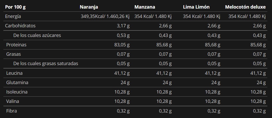 Sabor naranja: Leucina; glutamina; Valina; Isoleucina; ácido cítrico (acidulante); sabor a naranja (sabor); betacaroteno (colorante); sucralosa, acesulfame K (edulcorantes).