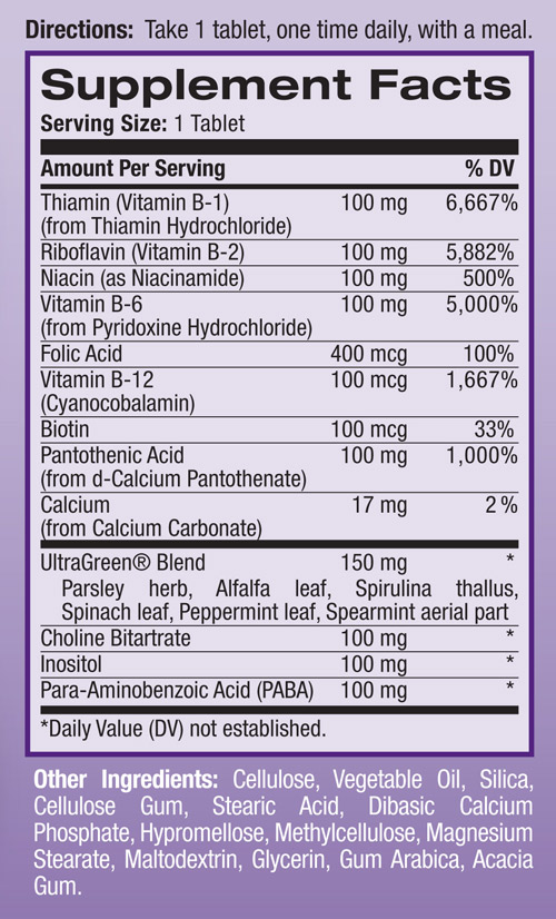 Cada tableta contiene vitamina B1 (tiamina clorhidrato), vitamina B2 (Riboflavina), niacina (niacinamida), vitamina B6 (clorhidrato de piridoxina), ácido fólico, vitamina B12 (Cianocobalamina), biotina, ácido pantoténico (calcio d-pantotenato), calcio (carbonato), UltraGreen® Blend (perejil, hoja de alfalfa, tallo de espirulina, hoja de espinaca, hoja de menta, parte aérea de menta verde) bitartrato de colina, inositol y PABA (ácido para-aminobenzoico).