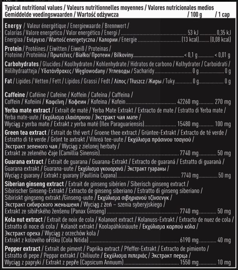 Cafeína, extracto de yerba mate, gelatina, extracto de té verde (de las hojas), extracto de guaraná, extracto de ginseng siberiano (de raíz), extracto de nuez Kola (de semillas), extracto de pimienta (de la pimienta entera), colorante E129.