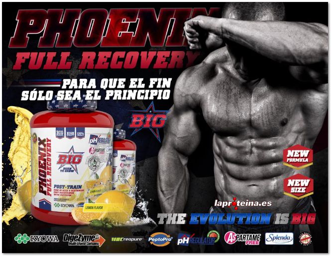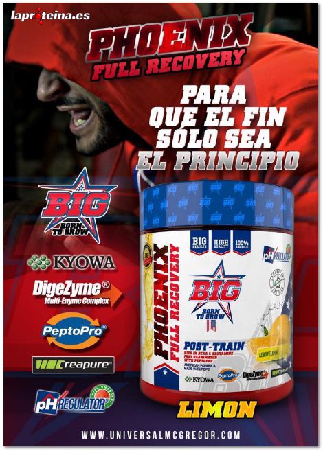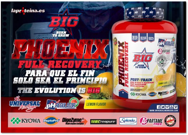 Phoenix® de la línea Big de Universal McGregror es una fórmula exclusiva para después del entrenamiento compuesta por almidón de maiz y una mezcla de dos fuentes proteicas de la más alta calidad junto con glutamina de Kyowa™, aminoácidos ramificados, creatina Creapure® y pH-regulator® para procurar un equilibrio en nuestro organismo neutralizando la acidosis.