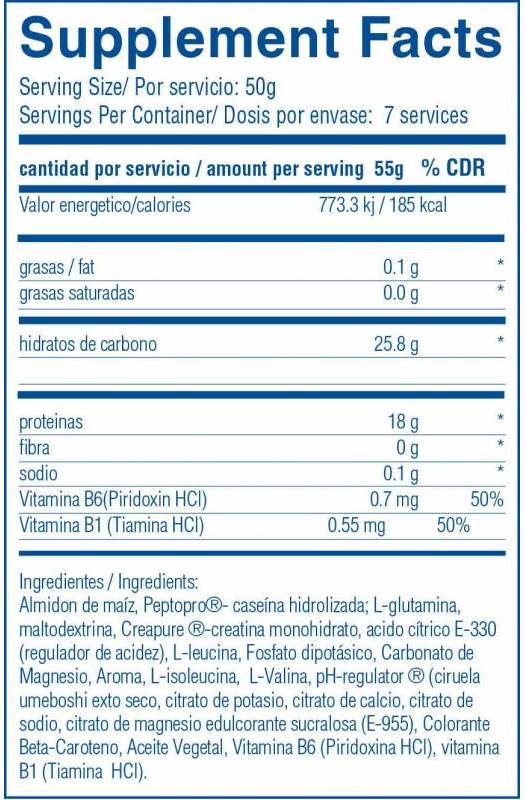 Almidón de maíz, aislado de proteína de suero parcialmente hidrolizada (contiene lecitina de soja como emulsificante), L-glutamina, maltodextrina, caseína hidrolizada, Creapure® creatina monohidrato, ácido cítrico E-330 (regulador de acidez), L-leucina, L-isoleucina, L-valina, aromas, pH-regulator® (ciruela umeboshi extracto seco, citrato de potasio, citrato de calcio, citrato de sodio, citrato de magnesio, edulcorante sucralosa (E-955), Colorante tartrazina E-102, Vitamina B6 (Piridoxina HCl), vitamina B1 (Tiamina HCl).