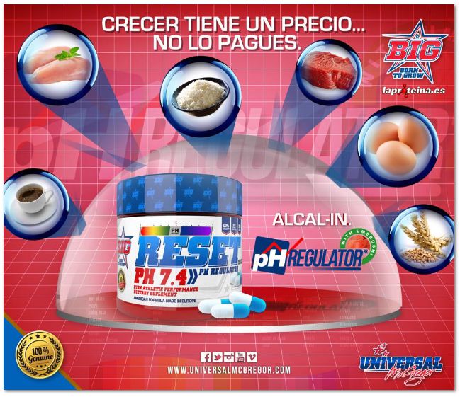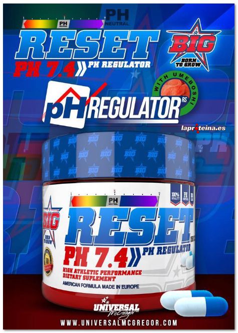 Reset pH Regulator de la línea Big de Universal McGregror es un suplemento diseñado para regular el pH de nuestro cuerpo aumentando la alcalinidad gracias a una mezcla patentada denominada pH-Regulator que combina citratos de potasio, calcio, sodio, magnesio y extracto natural de ciruela Umeboshi, considerado el mayor alcalinizante natural.