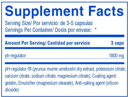 pH-regulator (Ciruela umeboshi exto seco, citrato de potasio, citrato de calcio, citrato de sodio, citrato de magnesio), estearato de magnesio (Emulgente), dióxido de sicilio (Antiaglomerante) y gelatina (Envoltura).