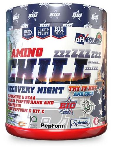 Amino Chill de la línea Big de Universal McGregror es una fórmula avanzada elaborada a base de aminoácidos con la calidad de Kiowa™, entre los que se encuentra el triptófano, el ácido gamma aminobutírico (GABA); con los péptidos de PepForm®; con extractos herbales como la melisa, la pasiflora o el lúpulo; con minerales y vitaminas entre los que se incluye el ZMA para favorecer el descanso nocturno, la recuperación muscular así como una óptima nutrición muscular y física para promover el crecimiento de nuestros músculos.