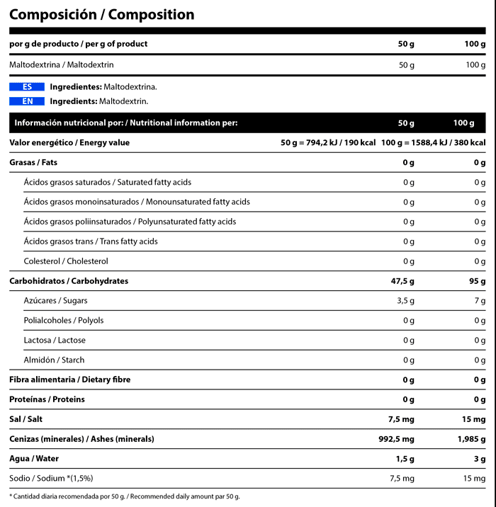 Como suplemento dietético para adultos sanos, mezclar 50 gramos (una cucharada colmada) de Maltodextrin con agua y tomar antes, durante o después del entrenamiento.