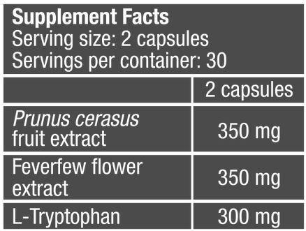 Extracto de la fruta Prunus cerasus, extracto de flor de matricaria (Tanacetum parthenium), L-triptófano, cubierta de la cápsula [gelatina, agua purificada, color (dióxido de titanio)], agente de carga (celulosa microcristalina), agentes anti-apelmazamiento (dióxido de silicio, estearato de magnesio).