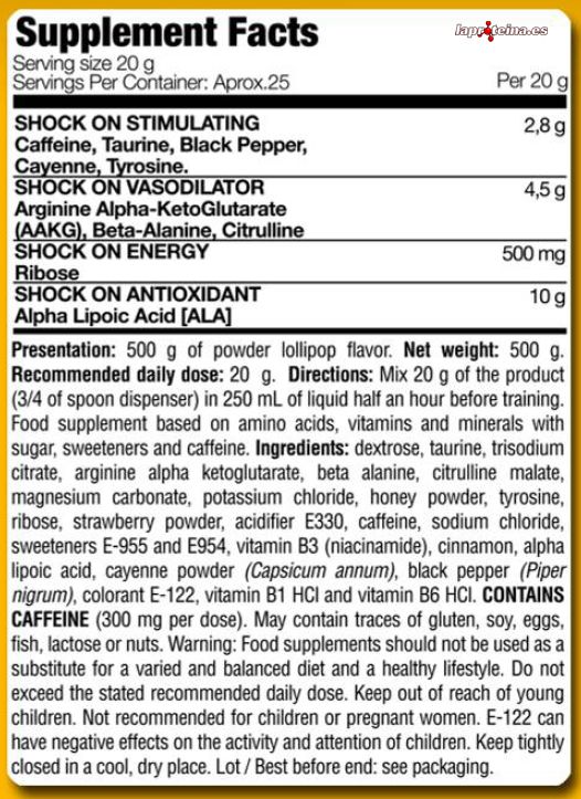 Un solo servicio de Shock On V2.0 te proporciona 4,5 de los compuestos vasodilatadores como la arginina alfacetoglutarato, la beta alanina y la citrulina malato; 2,8 gramos de potentes estimulantes del sistema nerviosos central como la cafeína, la taurina, la cayena (Capsicum annum), el extracto de pimienta negra o la tirosina; 500 mg de ribosa y 10 mg de ácido alfa lipoico.