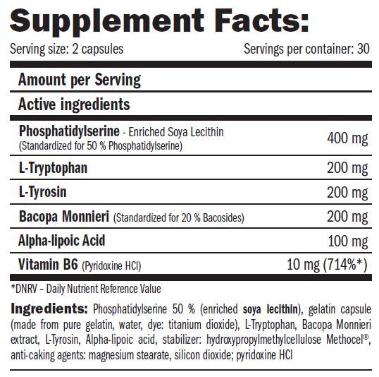 Fosfatidilserina 50% (enriquecida lecitina de soja), cápsula de gelatina (a base de gelatina pura, agua, colorantes: dióxido de titanio), L-triptófano, extracto de Bacopa monnieri, L-tirosina, ácido alfa-lipoico, estabilizador: hidroxipropilmetilcelulosa Methocel®, anti-antiaglomerantes: estearato de magnesio, dióxido de silicio; piridoxina HCl.