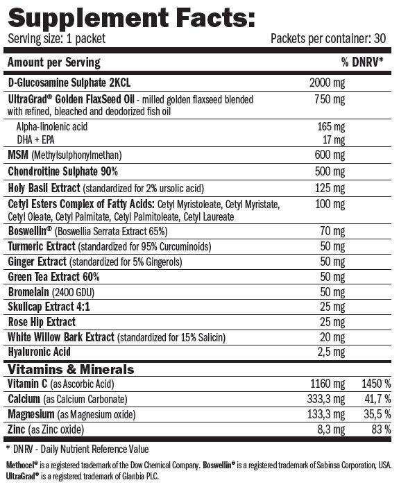Sulfato de Glucosamina 2KCl /de marisco/, Ácido ascórbico, Aceite de linaza UltraGrad con aceite de pescado, MSM (metil-sulfonil metano), sulfato de condroitina 90%, Cápsula de gelatina: Gelatina pura, Agua; Colorante: Dióxido de titanio; Carbonato cálcico, Óxido de magnesio, extracto de Ocimum tenuiflorum (2% de ácido ursólico), Cetil ésteres de ácidos grasos vegetales (miristoleato de cetilo, miristato de cetilo, oleato de cetilo, palmitato de cetilo, palmitoleato cetílico, cetílico laureato, maltodextrina de maíz), Goma arábiga, Extracto de Boswellia serrata 65%, Extracto de cúrcuma (95% cd curcuminoides), Extracto de jengibre (5% gingeroles), Extracto de té verde 60%, bromelina (2400 GDU), Extracto de Scutellaria, Estabilizante: Hidroxipropilmetilcelulosa Methocel; Antiaglomerantes: Celulosa microcristalina, Estearato de magnesio; Escaramujo, Corteza de sauce blanco (15% Salicina), Antiaglomerantes: ácido esteárico, Dióxido de silicio; Estabilizantes: Inulina, Carboximetilcelulosa; Óxido de zinc, Ácido Hialurónico.