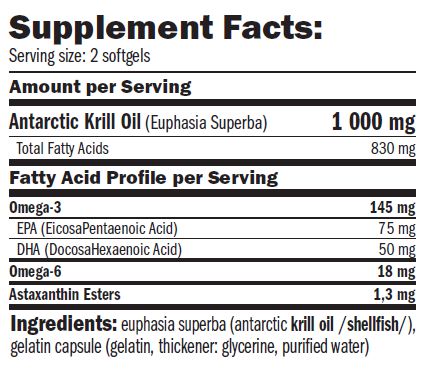 Euphausia superba (aceite de kril antártico/mariscos ), cápsula de gelatina (gelatina, espesante: glicerina, agua purificada).