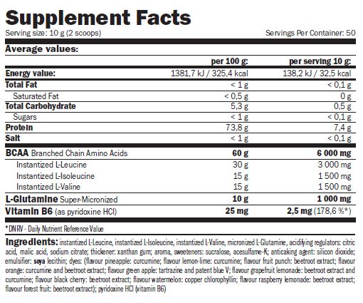 L-leucina instantánea, L-isoleucina instantánea, L-Valina instantánea, L-Glutamina micronizada, acidificantes reguladores: ácido cítrico, ácido málico, citrato de sodio; espesante: goma de xantano; aroma, edulcorantes: sucralosa, acesulfamo-K; antiaglutinante: dióxido de silicio; emulsionante: lecitina de soja; colorantes: (sabor piña: curcumina; sabor lima-limón: curcumina; sabor ponche de frutas: extracto de remolacha, sabor naranja: extracto de curcumina y remolacha, sabor manzana verde: tartrazina y azul patente V; sabor pomelo limonada: extracto de remolacha y curcumina; sabor cereza negra: extracto de remolacha, sabor sandía: clorofilina de cobre; sabor limonada de frambuesa: extracto de remolacha, sabor frutas del bosque: extracto de remolacha); piridoxina HCl (vitamina B6).